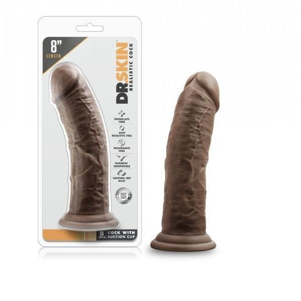Dr Skin 8 inches Cock With Suction Cup Base Chocolate Brown from Blush Novelties. Thick. Extra girth for those seeking to stretch their limits. Real feel. Detailed for a realistic look and feel. Versatile. Strong suction cup and o-ring harness compatible. Peace of mind. Made of body safe non-porous PVC. Contains no synthetic fragrance or latex. Size 8 inches in total length, 7.5 inches insertion length by 2 inches in width. The doctor is in! The Dr. Skin 8 inches Realistic Cock is a realistic dildo with a sturdy suction cup base that holds to any flat surface for solo time. Or partner up for strap-on harness fun! This Dr. Skin Realistic Cock is made of safe and soft PVC. To clean use soap and water or a toy cleaner then let air dry.