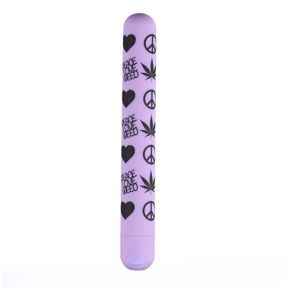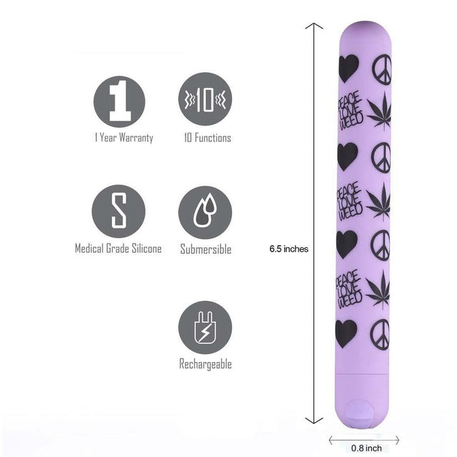 Specifications: Color Violet with Peace, Love, Weed Print. Functions 10 speeds of pulsating vibrations. Strong motor. Silicone coating. USB Rechargeable. Waterproof vibrations and submersible for bath tub play. Item dimension height .8 inch, width .8 inch, length 6.5 inches. Bulk weight 1.6 ounces. Package dimension height 3.1 inches, width 1.2 inches, length 7.9 inches. Package with product weight 2 ounces.