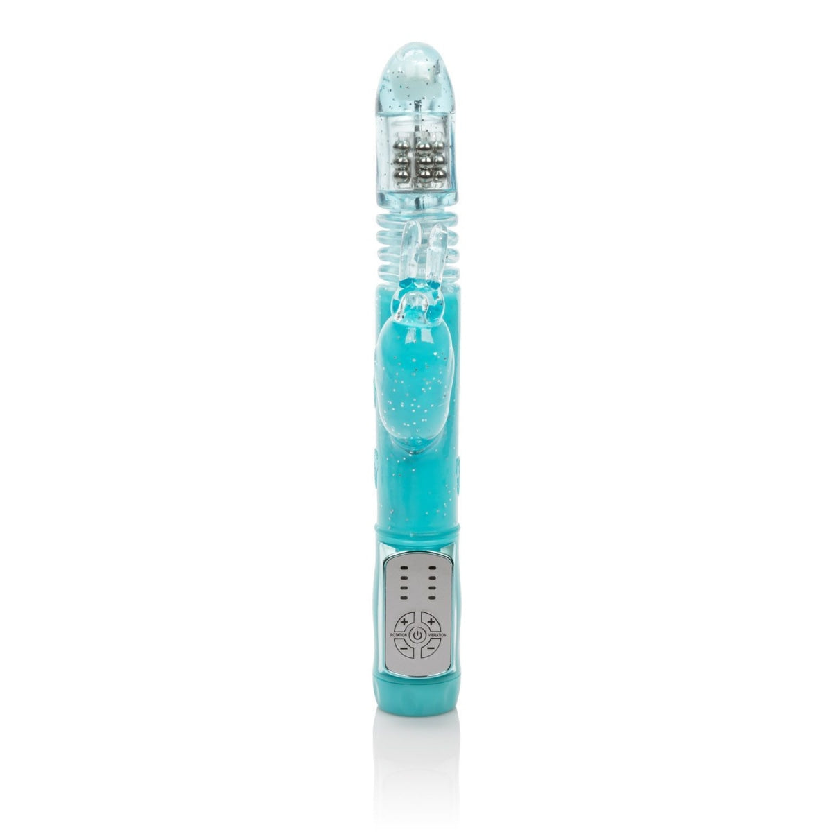 Dazzle Xtreme Thruster Blue Rabbit Vibrator. Multiple rows of non-jamming pleasure beads. An ultra power motor means this toy is specially designed for the most intense experience. Designed for easy use, you will find operation a snap even on the darkest night. Frustration free and perfect for pleasure, just one push brings intense stimulation your way. Bulk weight 8.4 ounces. Materials Thermoplastic Rubber TPR, ABS Plastic with Metallic Plating. Functions a variable speed control takes you to the height of gratifying pleasure. You will find sensual stimulation that throbs with excitement. 12 functions bring you thrilling elements of vibration, pulsation, and escalation. Experience the ultimate bedroom adventure! This product thrusts and rotates, providing exciting sensual pleasure. Warranty information order with confidence as this item comes with Cal Exotics standard 90 day warranty. Battery information crafted for simple operation, power with 3 AAA batteries, not included. Measurements 2.75 inches by 1.25 inches Rabbit. 5.25 inches by 1.25 inches Shaft.