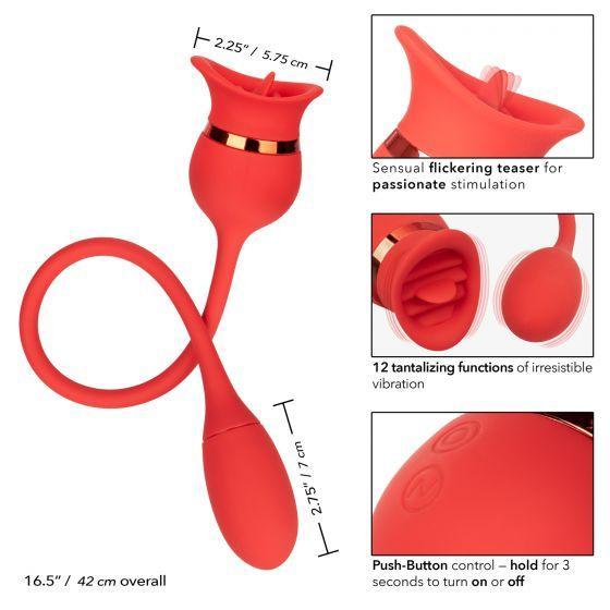 French Kiss Casanova Red Vibrator from California Exotic Novelties. Oh Casanova! The sensual French Kiss Casanova is an irresistible flickering teaser with a powerful vibrating bullet made truly passionate playtime. This powerful vibe will show you true ecstasy with every flicker of the tongue teaser, dual vibe motors and 12 functions of vibration. While the flickering teaser works its magic, the powerful bullet flexes and moves with your body to deliver knee shaking vibrations. The teaser and bullet can be used independently or simultaneously for breathtaking stimulation. The full contact scoop and fluttering tongue teaser has been crafted to perfectly contour to your most intimate pleasure points. The soft supple silicone and sensually contoured body let you deliver pinpoint pure pleasure form almost angle. Use the easy touch button to control up to 70 minutes of vibrating pleasure. Recharge up your pleasure in only 100 minutes with the provided USB cable into the self-healing charging port on the massager. The mini massager discreet size and travel lock button makes it the perfect travel companion, letting you embrace radiating pleasure wherever your fantasies take you.