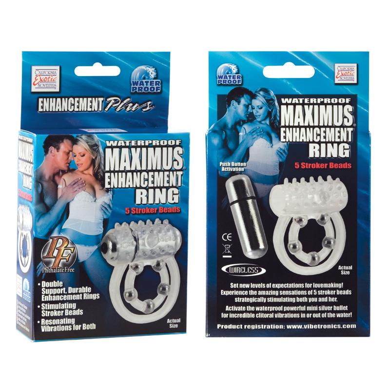 Waterproof Maximus Enhancement Ring 5 Stroker Beads is soft, stretchy, and durable double enhancement ring. Maximum support and control for him, strategically placed stroker beads and love nodules for her. Wireless mini vibrating bullet provides powerful clitoral stimulation. Batteries required to power up 3 watch, 6 included. Enhancer measures 2.5 inches long by 2 inches wide. Stimulator measures 2 inches long by .75 inch wide. Bulk weight 1.1 ounces. Safe and pure for body and pleasure. Made using Phthalate free, non-toxic materials: unscented Thermoplastic Rubber TPR enhancer, ABS plastic stimulator. Category: For Men, Rings & Sleeves, Rings. Waterproof Maximus, Enhancement Ring are registered trademarks for California Exotic Novelties. Sex toys and sexual wellness. New high resolution images added.