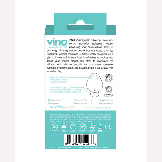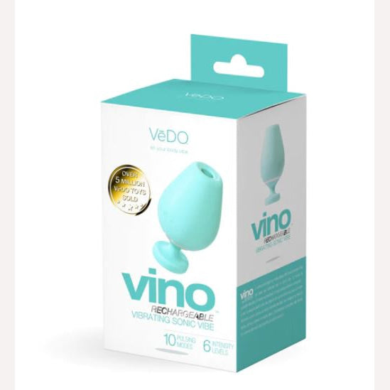 Vedo Vino Vibrating Sonic Vibe Turquuoise from Vedo. Vino Rechargeable Sonic Vibe sends powerful pulsating waves, pleasuring your entire clitoris. With 10 pulsating modes and 6 intensity levels, this vibe keeps you wanting more. Sleekly designed like a glass of wine, this sonic vibe lends itself to effortless control. Place your fingers around the stem to maneuver the silky smooth Silicone mouth for maximum pleasure. Completely submersible, it is up for any type of water play. Vibe boasts 10 extremely powerful vibration modes. The uniquely designed handle lends itself to effortless control as it easily fits between your index and middle fingers. The perfectly sized, flexible ears, nubbed tip and ribbed tummy allows your hot spots to be teased and pleased in so many ways. Whisper quiet and completely submersible, this super cute silicone vibrator is a must have. Travel Lock. One year warranty. Categories: Vibrators, Clitoral Stimulators, Sex Toys for Women, Clit Cuddlers. 2023.