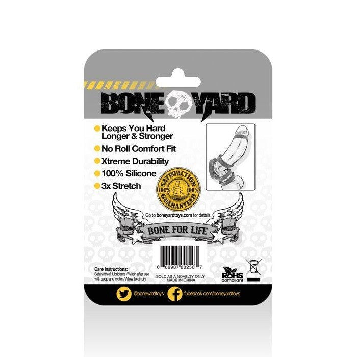 Boneyard Silicone Ring 50mm e or approximately 2 inches Black. Boneyard Silicone Ring 2 inches 50mm Black. These must have man toys are designed with superior materials and production thus increasing both comfort and lifespan. The powerful and iconic Boneyard-branded design has a sleek silicone finish and features a superior and durable 3x stretch. The soft medical grade 100% silicone rings and non-roll design provide a snug fit that both the wearer and his playmates will appreciate. Unique to themselves, these rings synergize with the wearer, providing endless comfort when wearing under your jeans. You can be assured that they will withstand the punishment of your longest play sessions time and time again. Keep you hard longer and stronger. No roll comfort fit. Xtreme durability, 100% silicone, 3X stretch. Care instructions: safe with all lubricants. Wash after use with soap and water. Allow to air dry before storage. Phthalate free, body safe Silicone. Bone for life. Phthalate free, body safe Silicone. Bone for life. 17