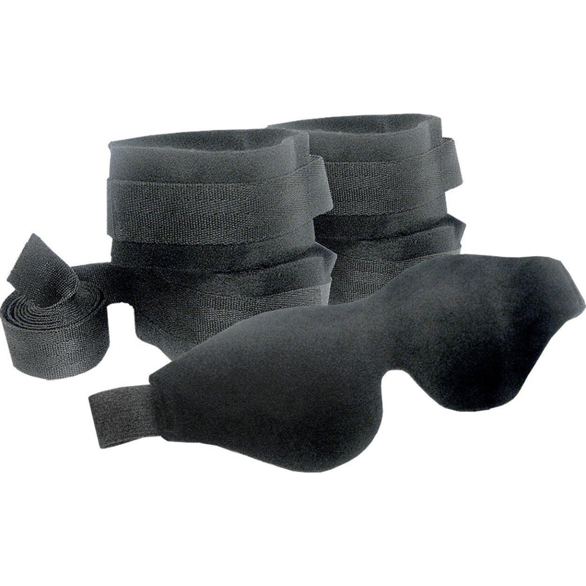 Sex and MIschief Essentials for Bondage 101. Beginners Bondage Fantasy Kit with four wrist and ankle restraints attached to nylon straps, this set is sure to produce a happy ending. Now includes a Soft Blindfold and it is pure bondage heaven for any novice. Kit includes 4 wrist or ankle restraints, one 44 inches connector strap and one soft blindfold. One size fits most. Category: Restraint, Role Play, Restraint Play. Details: the perfect kit to explore fantasy restraint play! Includes 4 wrist/ankle straps with 44 inches connector straps and one soft blindfold. Adjustable straps for easy on, easy off play! Materials: Velboa fabric, Velcro, polypropylene webbing, elastic. Includes: 4 Wrist & Ankle restraints with 44 inches connector straps, 1 soft blindfold. Beginners Bondage Fantasy Kit is a registered trademark for Sportsheets. Sportsheets keeping couples connected. 18