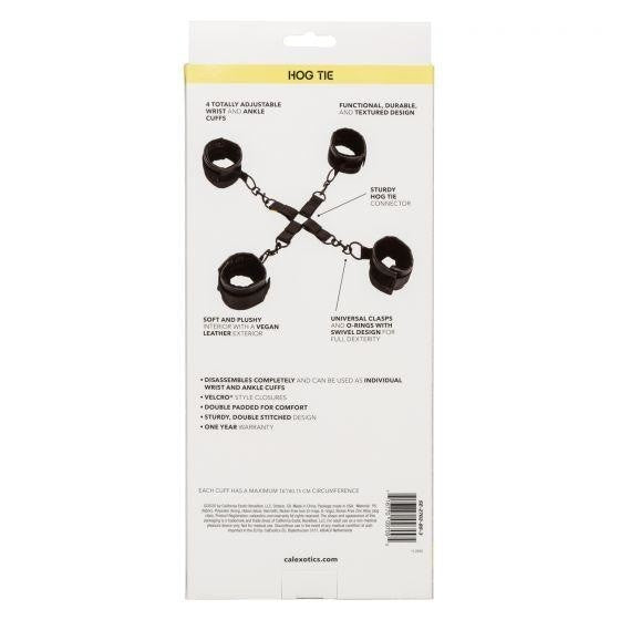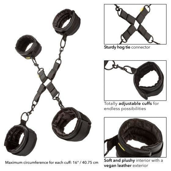 Boundless Hog Tie from California Exotic Novelties. If you are serious about exploring your sexual boundaries, the Boundless Hog Tie is the ultimate in adult toys. Bind your submissive partner with their hands and feet behind their back, or in the front, and take full advantage of their position. The sturdy cuffs and ankle ties included are great for BDSM/Roleplay in full bondage, totally controlled by the dominant partner in the couple. With 2 fully adjustable ankle cuffs and 2 fully adjustable handcuffs bound with Velcro style hook and loop fasteners, this hog-tie also comes with universal clasps and o-rings with a swivel design for full dexterity and maximum comfort, while being totally bound. The soft, plushy interior provides extreme comfort even while your extremities are pointed to the sky, and the vegan leather exterior looks rough enough to play hard. The doublepadded, double stitched design doubles down on the comfort and rough play, ensuring that this high quality product lasts for many nights to come. If you want to tone it down a bit, the Boundless Hog Tie