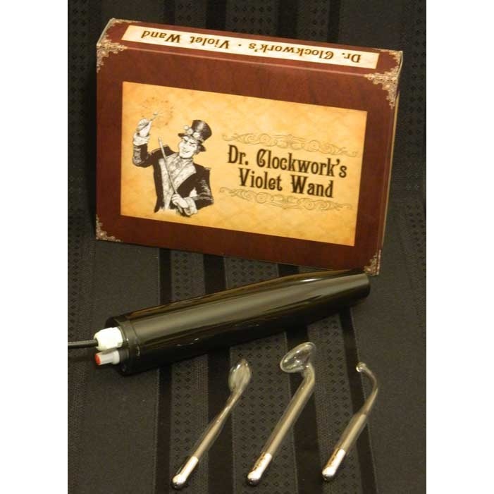 Dr Clockwork Violet Wand Kit with Purple Electrodes solid state travel kit. Fun for beginners and advanced players alike! Sleek, but sturdy case is great for travel. Comes with Dr. Clockwork Solid State Violet Wand, hard plastic travel case, and three uniquely shaped electrodes. Convenient and affordable gift idea. Whether you are a beginner or an advanced player, the Dr. Clockwork Violet Wand Starter Kit is the perfect kit for you. With the three included electrodes, beginners can benefit from the variety of sensations that they can create with their violet wand as they master the use of this unique toy. Dr. Clockwork Solid State wand, three electrodes, and a travel case. The petite, hard plastic case measures a scant 9.5 inches by 7.5 inches by 2.5 inches making it the perfect travel toy that you can toss in a toy bag or check in your luggage for long distance trips. No longer do you need to carry around a suitcase full of gear. Always safety first! The most important thing to bear in mind when using this accessory is safety. You are dealing with electricity so there are plenty of warnings and precautions that you need to be aware of before getting started. First of all, you should not use the violet wand on people with pacemakers, nerve damage, heart conditions, or electrical imbalances eg epileptics. Finally, you should not use violet wands on people with Insulin Pumps or other Electronic Medical Devices. Never use on pregnant women. Dr. Clockwork's Home for Electrical and Medical Oddities from Lebanon, New Jersey.
