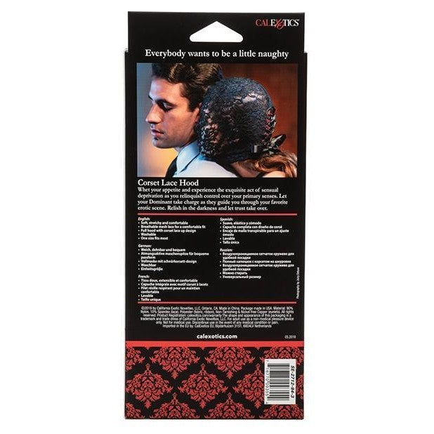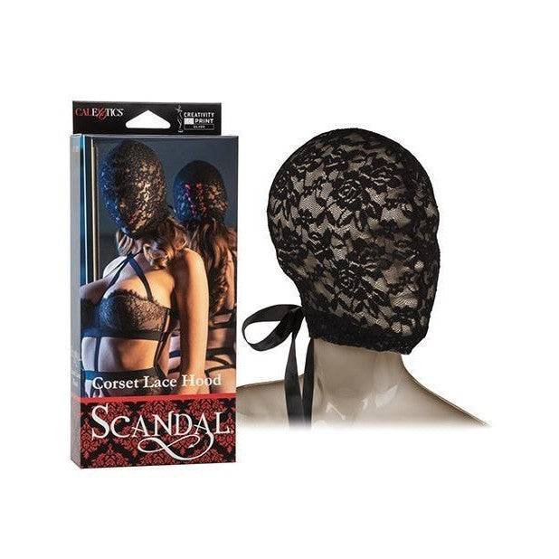 Scandal Corset Lace Hood from California Exotic Novelties. Scandal Corset Lace Hood is a full hood with a stunning lace up design. Breathable mesh lace for a comfortable fit. Washable. One size fits most.