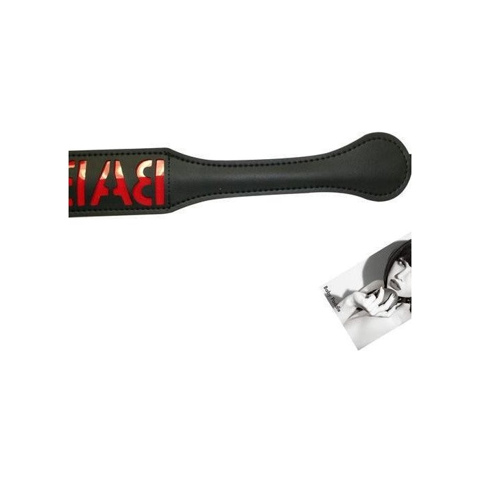 Sex and Mischief Baby Paddle. Black vinyl paddle with BABY design. 12 inches handle allows for more power behind the spanking. Wrist strap keeps paddle in place. BABY text is backwards for proper display on your skin. Leaves a great impression on your partner. Black on red. Includes: 1 BABY Black Paddle 12 inches in length. Materials: polyvinyl, RBS E-glass batten, nylon.