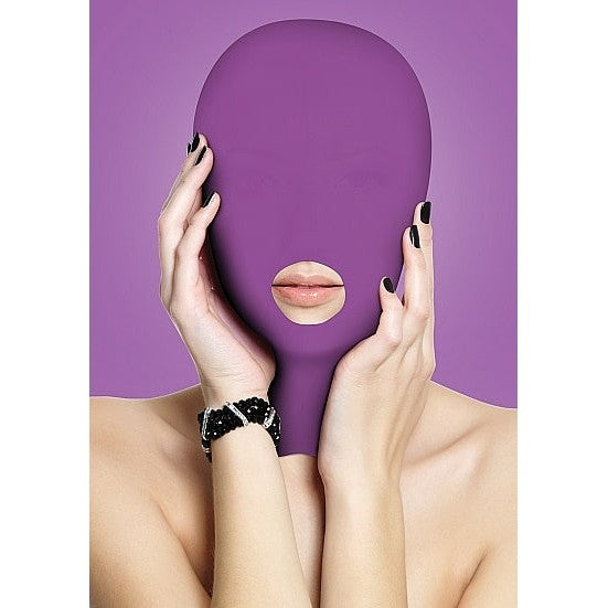 Ouch Submission Mask Purple. This comfortable Submission mask is designed to stretch completely over the head and closes easily at the back with a zipper. The fabric allows just a hint of light in while impairing vision and awakening other senses. The shiny hood can be worn by him or her, and the thin lightweight fabric makes breathing and hearing a snap. Best of all, you still have access to your subject's mouth! One size fits most. Material Spandex. Dimensions package 7.09 inches by 4.72 inches by 0.59 inch. Weight package 2.26 ounces.