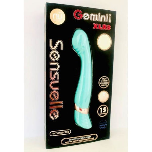 Sensuelle Geminii XLR8 Electric Blue Vibrator features a unique 18 second turbo boost. Rechargeable vibrations. 15 functions. Waterproof for play outside the bedroom. Accelerate your pleasure with the unique turbo boost.