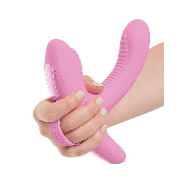Your sensual delight begins with the pleasure ribs that titillate the clitoris and G-Spot with extra sensations. Internally, the Rock N’ Grind is gently curved to match intimate contours while delivering arousing vibrations and sensual stimulation. The curved base pleasures you externally and provides both a clitoral stimulator and anal teaser. A positioning strap underneath allows you to control the rocking, grinding, and movement with slip-proof ease.