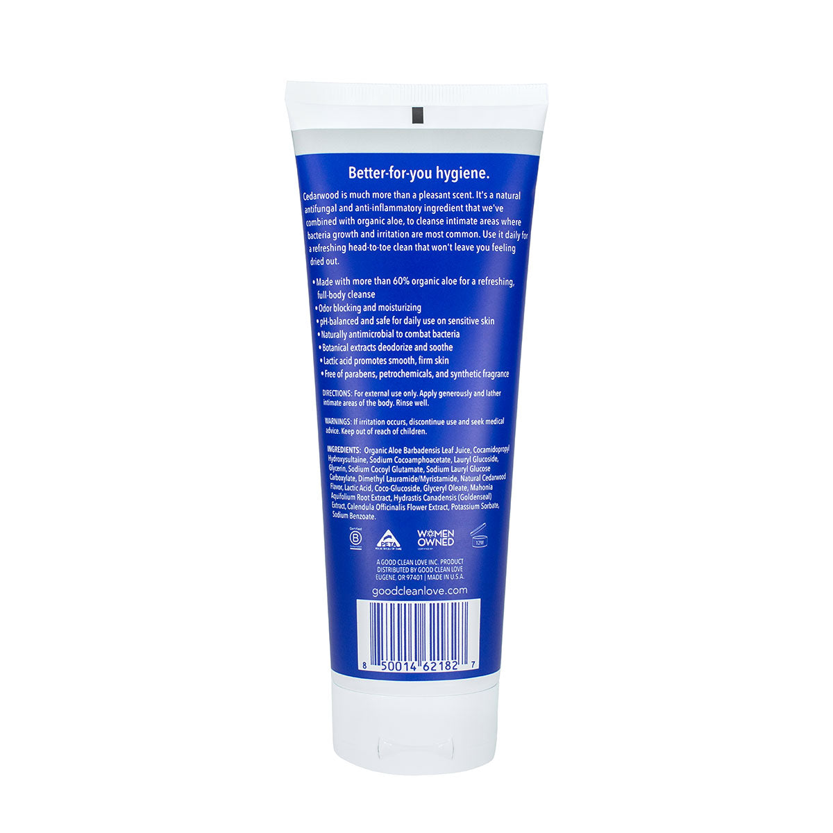 Cedarwood is an antifungal and anti-inflammatory ingredient that Good Clean Love has combined with organic Aloe to cleanse areas like the groin, butt and armpits, where bacteria growth and irritation are most common. Use daily for a refreshing head-to-toe clean that won't leave skin feeling dried out.