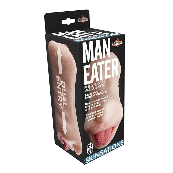 Skinsations Man Eater Pussy Mouth Masturbator Beige dual entry male stroker from Hott Products. 2 in 1. Super soft realistic feel contoured mouth with tongue and soft teeth. Realistic vagina with enhanced pleasure walls.