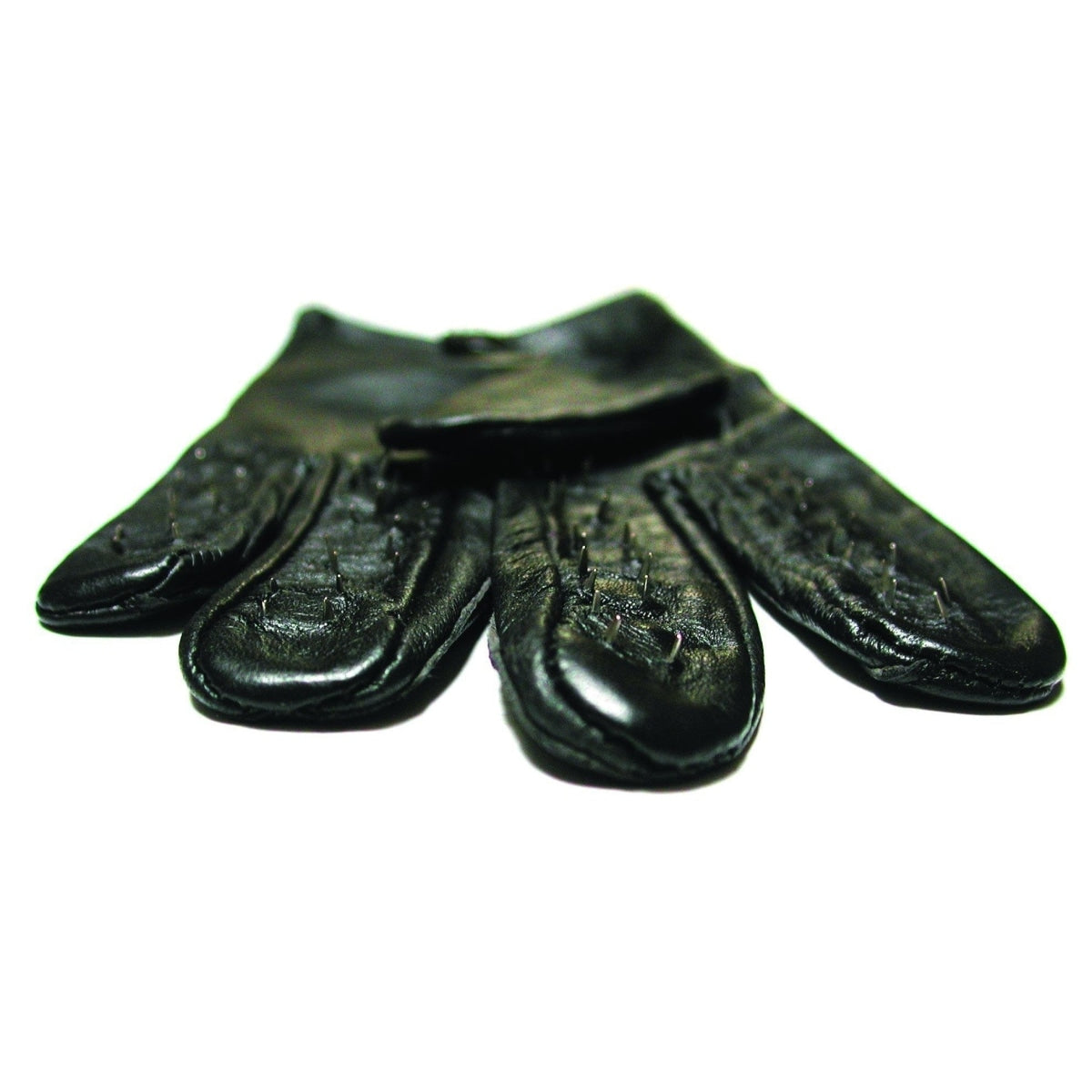 Kink Lab Vampire Gloves Leather with Prickly Metal Points Extra Large. Soft, thin, sexy leather gloves with a fierce side: prickly metal points on the palms and fingertips. Glove creates an intense ticklish sensation. Great for sensory play. To turn up the play try with a blindfold. Buttery soft leather that hides a bite, Kink Lab's vampire gloves are an excellent tool for sensation play, masochism, and all sort of other kinky fun. The bottom of each finger is studded with lots of sharp points, making each touch and grab gasp inducing, punctuating even the slightest sensations. Available in four different sizes to fit almost any user, try the pair on a submissive, or use one glove on each other for an incredible experience. Color: Black. Type: BDSM Gloves. Material: Leather, Metal. Size: Extra Large.