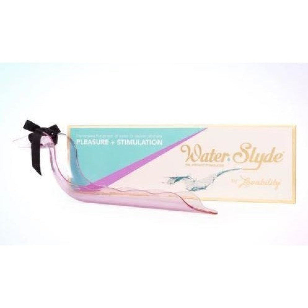 Waterslyde Aqua Maureen Aquatic Stimulator from Lovabilty. The patented Waterslyde, is a sleek plastic water diverter that simply attaches to most forward facing bathtub spouts. The water flow is easily directed to the midline of the bathtub, allowing a woman to comfortably position herself in the tub such that the water falls directly to where it counts. The bathtub technique, can be great fun but not always easy to achieve. Until now! Dimensions 16 inches by 3.5 inches by 2 inches. Creator Maureen Poliack. For external use only. Use the suede like ribbon to tie to bath tub faucet. Caution of hot water. Body safe. Hands free. Disability friendly. Recyclable. Satisfaction guaranteed. XBIZ Award Nominee. "After owning it for a few weeks...I can not stop using this thing!" Ducky Doolittle. Made in the USA.
