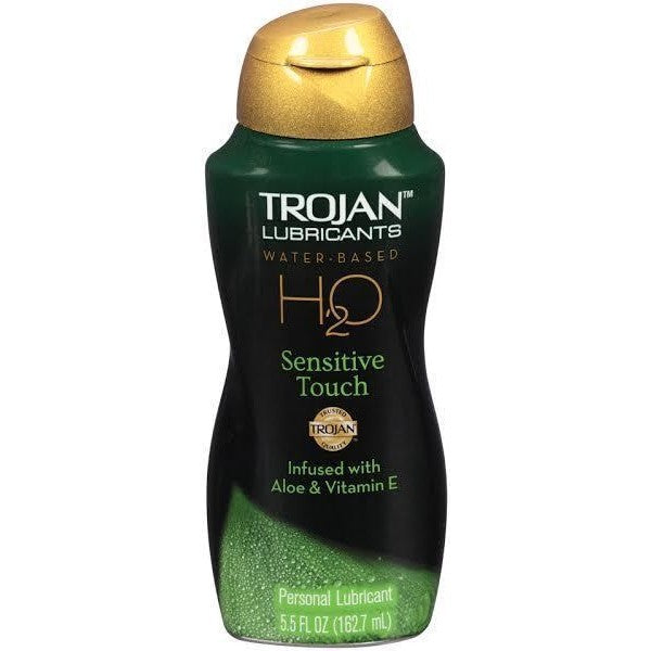 Trojan Lubricant H2O Sensitive Touch ultra smooth Aloe and Vitamin E in every drop. Mess free and non-sticky. Fragrance and dye free. Nourishing essentials for the next level of pleasure. Hyaluronic moisturizers hold 1000 times their weight in moisture for advanced lubrication.