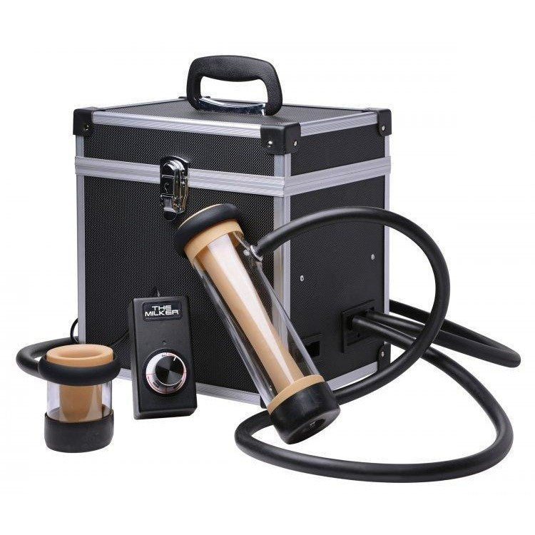 Love Botz The Milker Automatic Deluxe Stroker Machine. Very excited to introduce our new Milker Automatic Deluxe Stroker Machine! Designed to do all the hard work for you, this love machine is specifically designed for automatic stroking and sucking, with two cylinders for a variety of sensations. This multi-speed machine houses everything you need discreetly in the top. Just plug the hose into the cylinder and use the dial to control how fast or slow you want it. Two cylinders are included. The first is specially designed to suck your shaft, at nearly 9 inches long and lined with supple rubber for a tight seal. The smaller cylinder is for more targeted pleasure, such as your cock head or even the clitoris or nipples. Use it alone or with a partner, for foreplay, solo play or anything you can dream up. Designed to bring you the ultimate in orgasmic stimulation. All accessories store easily in the top compartment, which has a lock and 2 keys for the ultimate in portable discretion. Measurements 11 inches in length, 8.25 inches in width, 11.75 in height. Material: ABS plastic, silicone, natural rubber, metal. Color Black. Includes machine, 2 hoses, 3 hose plugs, 2 cylinders, remote, ACDC transformer, US power cable, and instructions. Please note this item weighs 15.81 pounds.