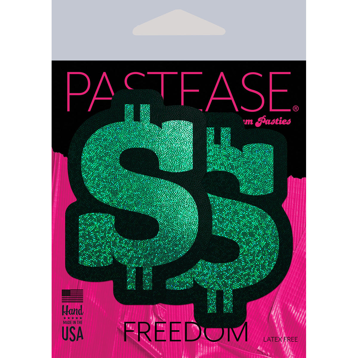 Green Glitter Dollar Sign Nipple Pasties by Pastease are hand-made in the USA of soft form-fitting glittery material that forms seamlessly to curves and resists wrinkling over hardening nipples.