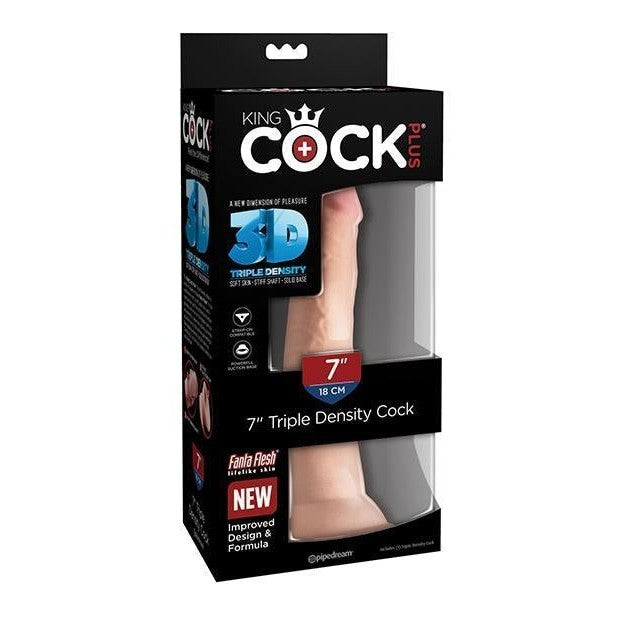 King Cock Triple Density 7 inches Beige Dildo from Pipedream Products. 3D Triple Density a new dimension in pleasure. The King Cock Plus 7 inches Triple Density Cock is made of new and improved Fanta Flesh material, making it stiff on the inside and soft on the outside. The life like outer skin is smooth to the touch, while the inner shaft is stiff and erect like an actual penis, making your pleasure experience as true to real life as possible. The solid suction cup has been redesigned for more adherence, giving you more versatility and convenience during use. The suction cup also makes this King Cock Plus 7 inches Triple Density Cock harness compatible.