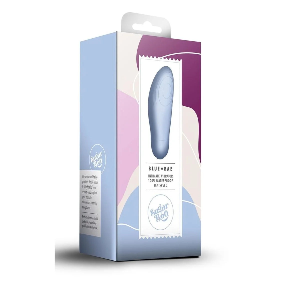 Sugarboo Blue Bae Intimate Vibrator from Rocks Off Toys. 100% waterproof for play outside the bedroom. 10 speed vibrator, Naturally part of loving life. Blue Bae intimate vibrator is beautifully crafted with sensory touch finishes.10 vibration sensations, Sugar Boo products will enhance your precious me time and invite shared sensual discovery moments. Love, live and always smile. We believe well being products should touch. Delight all of your senses, ensuring that your intimate experiences are truly exceptional. Size 1.57 inches in width, 6.65 inches in height, 1.57 inches in depth. Categories: Vibrators, Clitoral Stimulator, Sex Toys for Women, Clit Cuddlers. 2022.