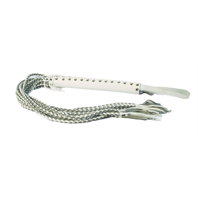 This flogger is the sexiest thing we've ever seen! The grey 11" sturdy handle is wrapped and laced up in its own white leather corset. Each 20"+ flange is braided with soft grey and white leather strips and tied off at the end. Strong 12" long wrist loop on the end. Excellent detail work!