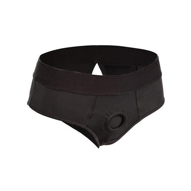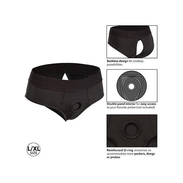 Boundless Backless Brief L/XL Harness Black from California Exotic Novelties. The Boundless Backless Brief is an ultra comfortable harness fashioned like a risque backless brief with powerful performance and comfort in mind. This bold harness has an extra wide waist band, soft stretchy fabric and reinforced O ring for the ultimate support. The durable, reinforced O-ring stretches to accommodate your favorite packer, vibrator or dildo. With a form fitting design, this comfort harness can be worn discreetly under clothes. Enjoy pleasure made for two with the double panel interior for easy access to your favorite probe. Beginners and expert users alike will love frustration free pleasure with this easy to wear harness. Simply secure your favorite probe, slip into the bold backless brief and dive deep into passionate penetration or enjoy comfortable all day wear. Enjoy easy clean up by machine washing and hanging to dry. Ladies sizes L to XL, Large to extra large. Material composition: 78% Nylon, 22% Spandex. One year warranty from California Exotic Novelties.
