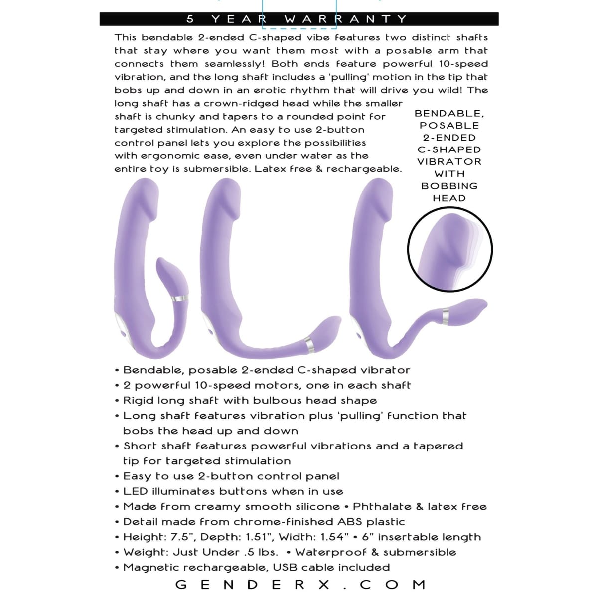 Features: bendable, posable 2 ended C shaped vibrator. 2 powerful 10 speed motors, one in each shaft. Rigid long shaft with bulbous head shape. Long shaft features vibration plus pulling function that bobs the head up and down. Short shaft features powerful vibrations and a tapered tip for targeted stimulation. Easy to use 2 button control panel. Light emitting diode LED illuminates buttons when in use. Made from creamy smooth Silicone. Detail made from chrome finished ABS plastic. Height 7.5 inches, depth 1.51 inches, width 1.54 inches. 6 inches insertable length. Bulk weight just under a half a pound, .5 pound. Waterproof and submersible vibrator. Made using body safe materials phthalate free and latex free. Powered by Magnetic rechargeable battery. USB cable included. 5 years warranty. Categories: Rechargeable Vibrators, Double Dongs, Sex Toys for Women, G-Spot Flexible Vibrators. 2022.