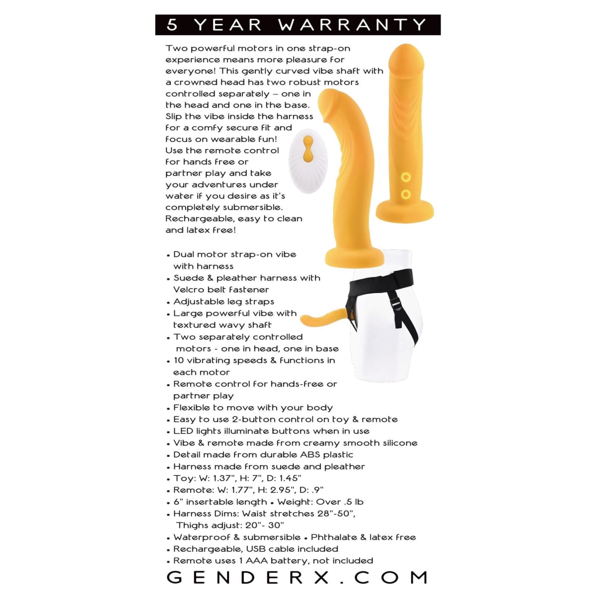 Specifications: dual motor strap on vibe with harness. Suede and pleather harness with Velcro belt fastener. Adjustable leg straps. Large powerful vibe with textured wavy shaft. Two separately controlled motors: one in head, one in base. 10 vibrating speeds and functions in each motor. Remote control for hands free or partner play. Flexible to move with your body. Easy to use 2 button control on adult toy and remote control. Light emitting diode LED lights illuminate buttons when in use. Vibe and remote control made from creamy smooth Silicone. Detail made from durable ABS plastic. Harness made from suede and pleather faux leather. Adult toy height 7 inches, depth 1.45 inches, width 1.37 inches. Remote control height 2.95 inches, depth .9 inch, width 1.77 inches. 6 inches insertable length. Bulk weight a little over a half a pound, .5 pound. One size fits most. Harness dimensions: waist stretches 28 inches to 50 inches, thigh straps adjust 20 inches to 30 inches. Waterproof and submersible vibrations for play outside the bedroom. Made using body safe materials both phthalate free and latex free. Rechargeable via USB cord, cable included. Remote control uses 1 AAA battery, not included. 5 years warranty. Categories: Rechargeable Vibrators, Strap Ons, Harnesses, Sex Toys for Women, Body Harnesses. 2022.