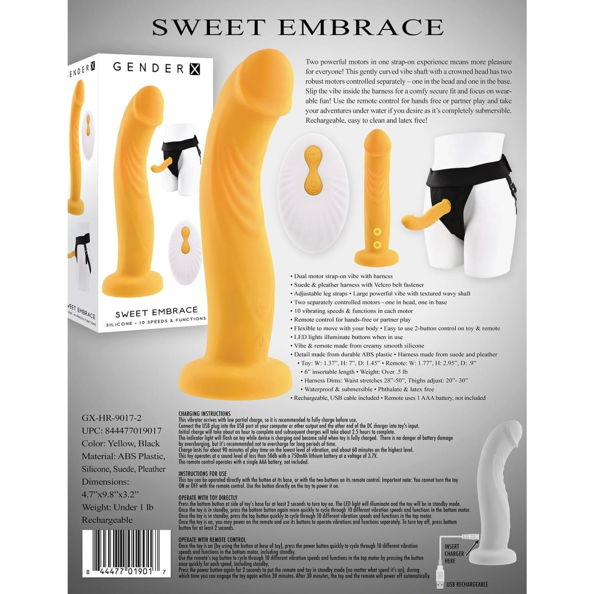 Gender X Sweet Embrace Strap On from Evolved Novelties. Two powerful motors in one strap on experience means more pleasure for everyone! This gently curved vibe shaft with a crowned head has two robust motors controlled separately: one in the head and one in the base. Slip the vibe inside the harness for a comfy secure fit and focus on wearable fun! Use the remote control for hands free or partner play and take your adventures under water if you desire as it is completely submersible for bathtub play. Rechargeable, easy to clean and latex free!