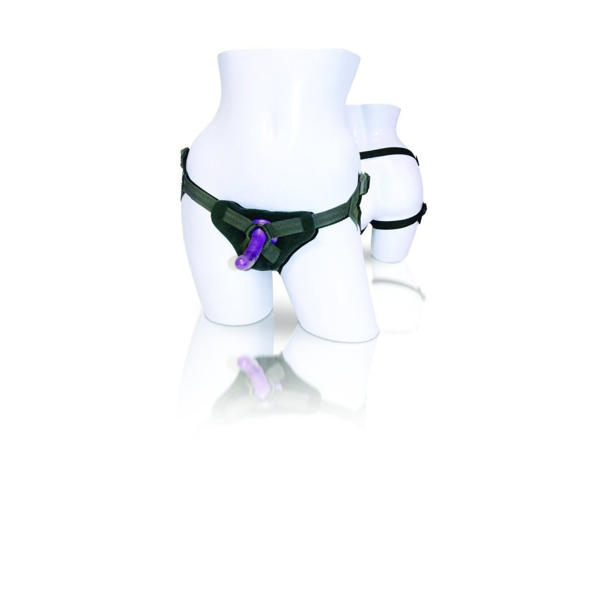 Sportsheets New Comers Strap On and Dildo Set introduce your partner to fantasy back door play with this beginner size silicone dong. 4 way adjustable nylon straps fit 26 to 60 inches hips. Please silicone dildo. Can accommodate dongs with a 1.25 inch width. Machine washable. Sportsheets New Comers Strap On and Dildo Set is a registered trademark for Sportsheets. Keeping couples connected. 18