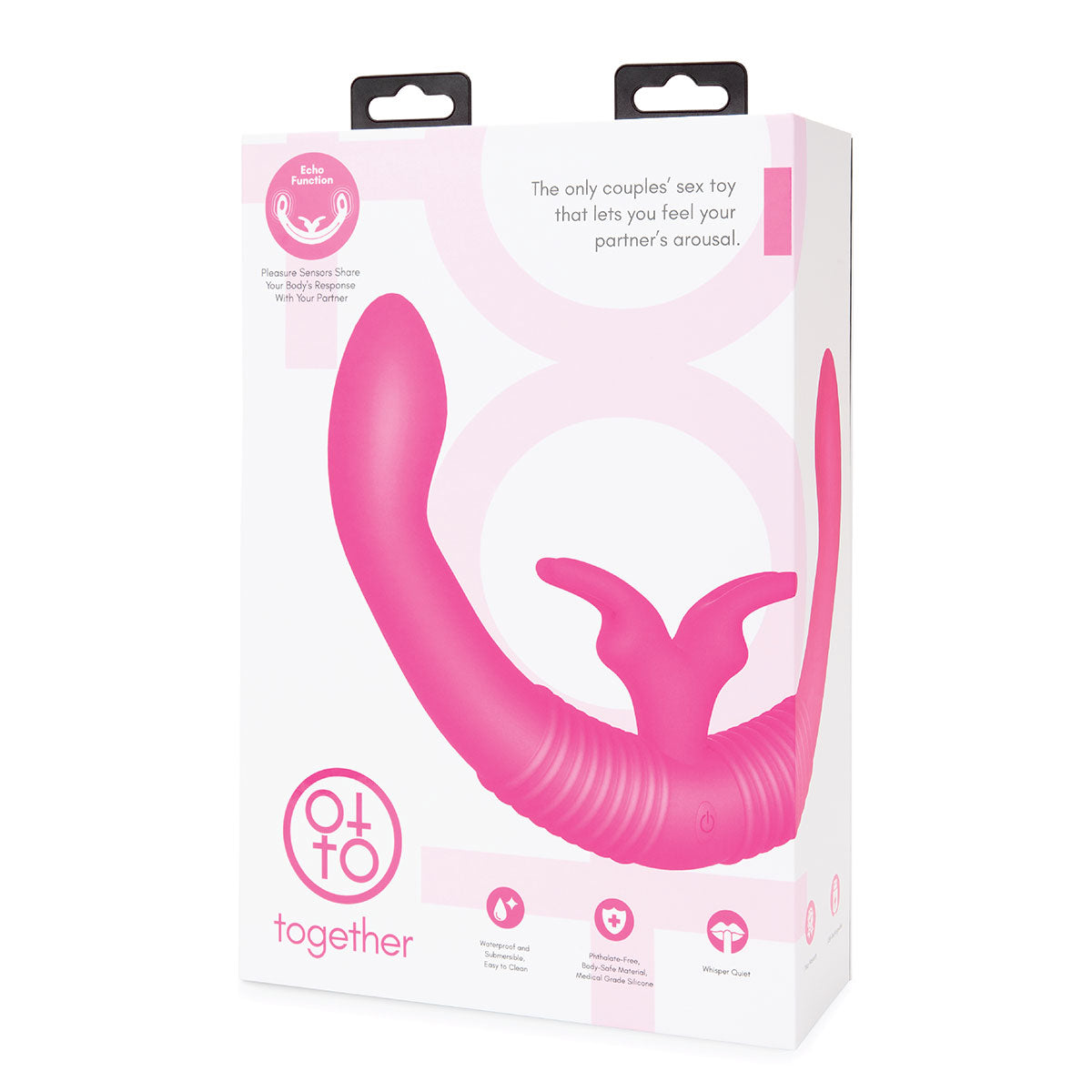Together's innovative approach to shared passion is designed to allow both partners to face each other, promoting closeness during intimacy. Great for face-to-face intercourse but also great when partners move into different positions. In addition to dual functionality for both partners, the design offers the perfect amount of tension for multiple positions, ideal for hitting both partners' g-spots and/or p-spots since the outer arms can be used vaginally and/or anally!