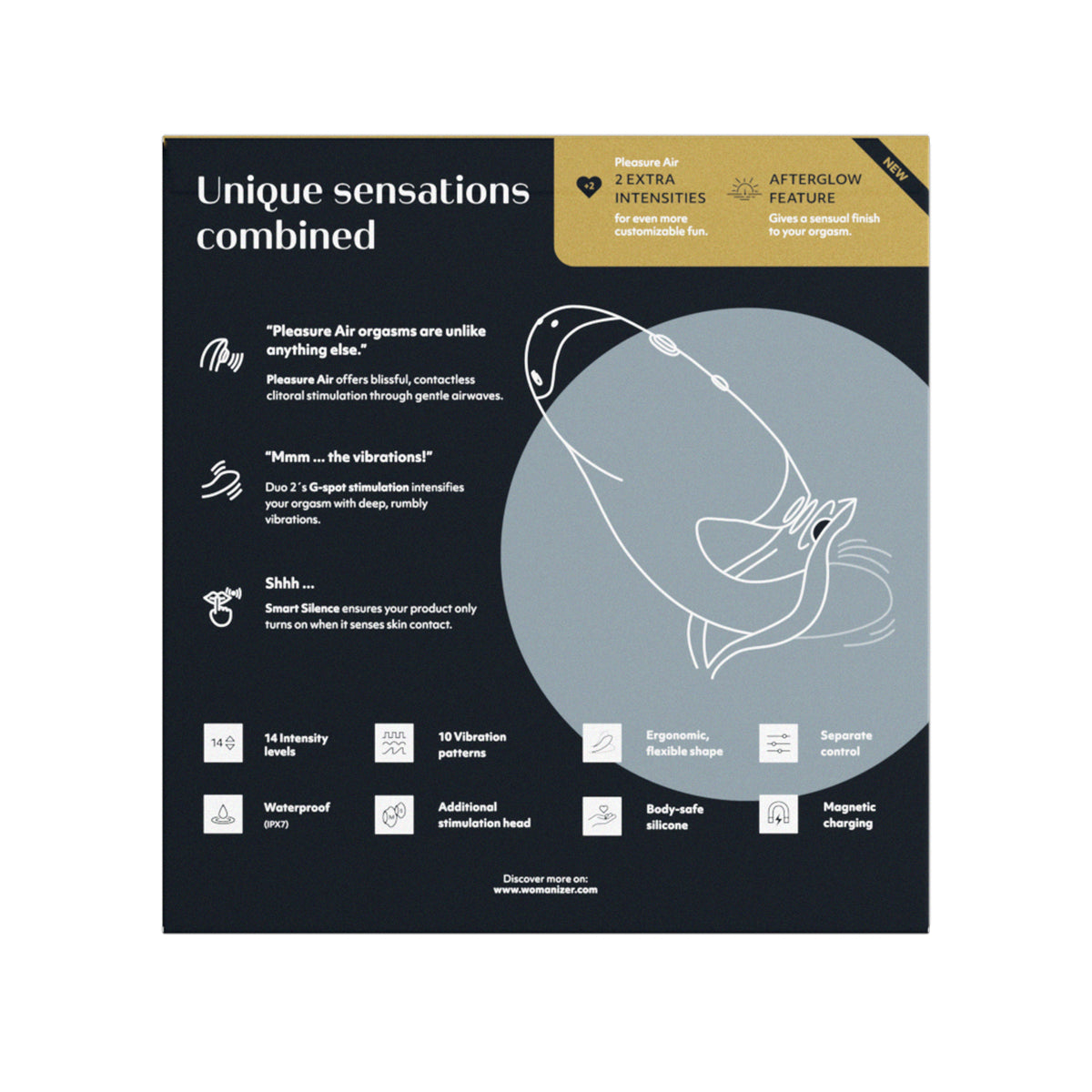 All Womanizer products feature a unique innovation called Pleasure Air Technology. Why is it so special? The clitoris is stimulated without direct contact. Gentle air vibrations suck and massage together at the same time to provide an unprecedented orgasmic feeling.