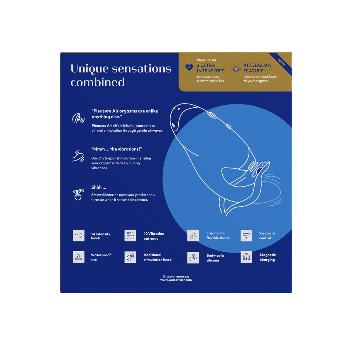 DUO 2 is a unique premium rabbit toy a Pleasure Air clitoral stimulator and powerful G-Spot vibrator combined to create advanced, blended orgasms. DUO 2 simultaneously targets the G-spot with deep rumbly vibrations and the clitoris with suction-like Pleasure Air stimulation, creating deeply satisfying blended orgasms.