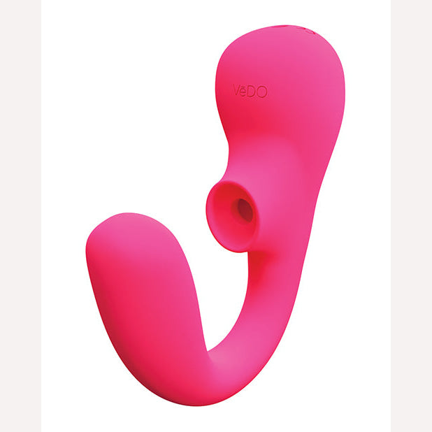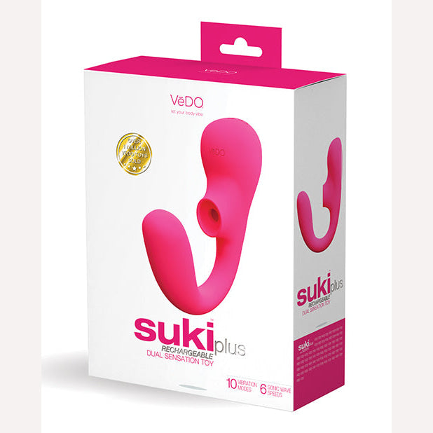 Vedo Suki Plus Dual Sonic Vibe Foxy Pink Vibrator. Let your body vibe. Step into our world of sensual play, where pleasure and desire meet to take you beyond your wildest imagination. Vedo adult toys were designed with your pleasure in mind. Suki Plus rechargeable dual sonic vibe powerfully sends pulsating waves while the flexible shaft simultaneously vibrates your G-Spot. With 6 sonic wave speeds and 10 vibration modes, this vibe keeps you wanting more. The sleek design lends itself to effortless control, allowing you to maneuver the silky, smooth Silicone mouth over your clitoris as your G-Spot is tickled for maximum pleasure. Completely submersible, this dual vibe is up for any type of water play, night in, night out. Categories: Vibrators, Rechargeable Vibrators, Sex Toys for Women, G-Spot Clit Stimulators, Clitoris Cuddlers. Restricted, Amazon Restricted. 2023.