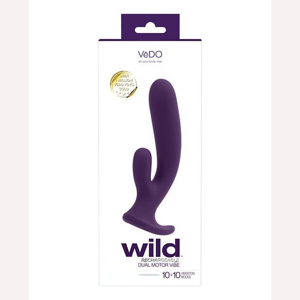 Vedo Wild Rechargeable Dual Vibe Purple. Vibrator runs on two independent motors. Extremely powerful motors. 3 speeds and 7 vibration modes. The flexible shaft will tickle and delight your g-spot while the tickler tickles and teases your clitoris. Sleekly designed with an ergonomic handle for maximium control this whisper quite vibe delivers and will have you screaming in activition. Just don't be afraid to get wet and wild. It is completely submersible.