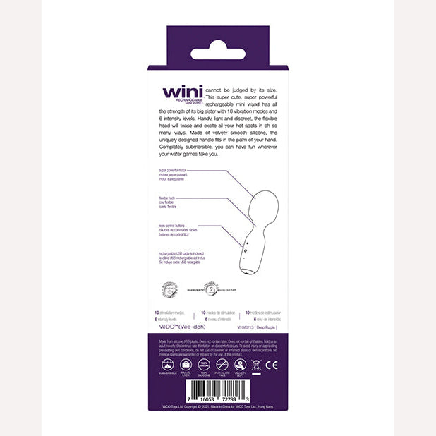 Over 1 million Vedo toys sold. Vedo Wini Rechargeable Mini Wand Deep Purple can not be judged by its size. This cute. super powerful rechargeable Mini Wand has all the strength of its big sister with 10 vibration modes and 6 levels of intensity. Handy, light and discreet, the flexible head will tease and excite all of your hot spots in oh so many ways. Made of velvety smooth Silicone. The unique handle fits in the palm of your hand. Submersible, you can have fun water games. Take you in water games. Fun wherever your water games take you.