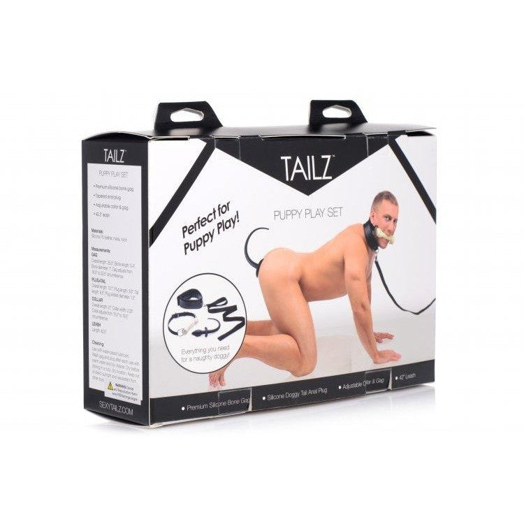 Tailz Puppy Play Set Silicone Bone, Gag, Tail Anal Plug and Collar from XR Brands. Everything you need to let out your inner puppy is included in this Puppy Play Set! This versatile set contains a silicone bone gag, flexible tail butt plug, and cushioned adjustable collar, use every item at once for a wild romp or use each item on its own for a more subtle way to puppy play. This set is made with high quality ingredients for a durable and body safe experience every session! The premium silicone bone gag is firm and satisfying to bite down on, and adjustable to fit most head sizes. The real star of this kit is the flexible silicone doggy tail butt plug, perfectly sized for most anal skill levels, and flexible for long term play! The cushioned collar is comfortable on the neck and fully adjustable, and pairs with an included 42 inches leash for a walk around the home. The tail and bone gag are made with phthalate free silicone for a worry free, body safe session. Clean before and after use with warm water and mild antibacterial soap. Compatible with water based lubricants, avoid use with silicone lubes. Measurements gag measurements overall length: 25.5 inches, bone length 5.4 inches, bone diameter 1 inch, gag adjusts from 18.5 inches to 23.5 inches in circumference. Plug+Tail measurements overall length 12.1 inches, plug length 3.6 inches, tail length 8.5 inches, plug widest diameter 1.2 inches. Collar measurements overall length 21 inches, collar width 2.25 inches, collar adjusts from 15.5 inches to 19.5 inches. Leash measurements 42.5 inches. Materials Silicone, Polyurethane PU Leather, metal, nylon. Color: Black collar, leash, and plug tail. White bone bit.. Please note package has a female on one side of the package and a male on the other side.