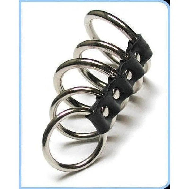Kink Lab 5 Gates Of Hell Leather. A Gates of Hell is a series of cock and shaft rings connected by a central spine. These Gates feature nickel plated steel held together by soft but firm oil tan leather. Five gates of hell, a wicked and attractively rendered classic bondage and Cock and Ball sex toy, is made of five nickel plated steel rings of varying sizes, permanently connected with a leather strap. The five gates of hell are slid one by one onto the male wearer, offering constriction and erection support as his penis becomes rigid and providing a pleasing visual effect. Color: Black. Type: Erection Harness. Materials: Leather, Nickel Plated Steel. Weight .34 pound.
