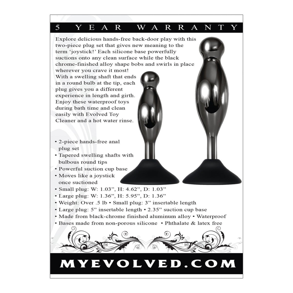 Features: 2 piece hands free anal plug set. Tapered swelling shafts with bulbous round tips. Powerful suction cup base. Moves like a joy stick once suctioned, Size Small Stick size length 4.62 inches, depth 1.03 inches, width 1.03 inches, insertable 3 inches. Large Butt Plug length 5.95 inches, depth 1.36 inches, width 1.36 inches, insertable 5 inches. Bulk weight over half a pound .5 pound. 2.35 inches suction cup base. Made from black chrome finished Aluminum alloy. Bases made from non-porous Silicone. Made using body safe materials Phthalate free and latex free. 5 years warranty. Evolved Novelties Love is Back.